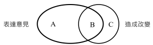 在面臨人際的歧見時,上圖代表我們對當事人所講的類型。右圓是代表造成改變,是好的改變;左圓是表達意見,表達自己的想法。